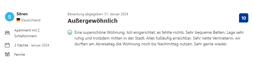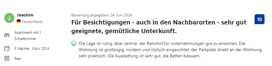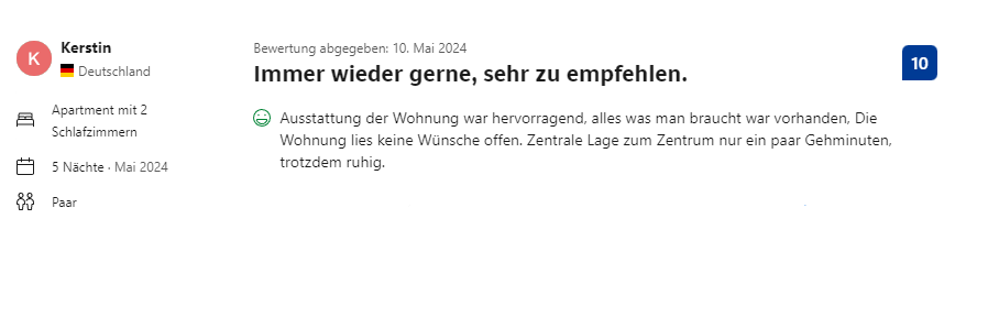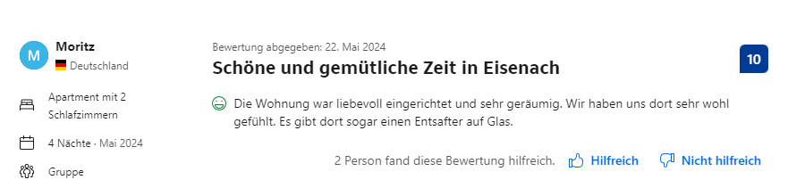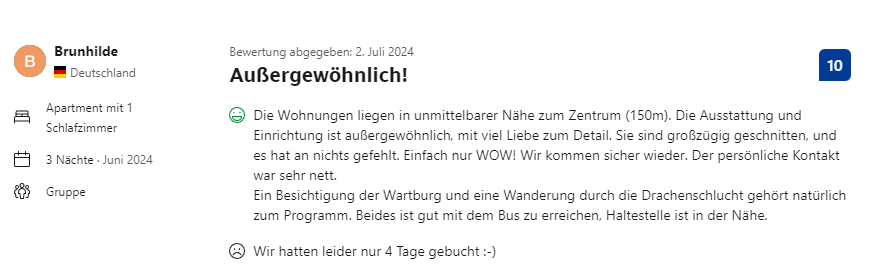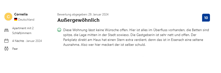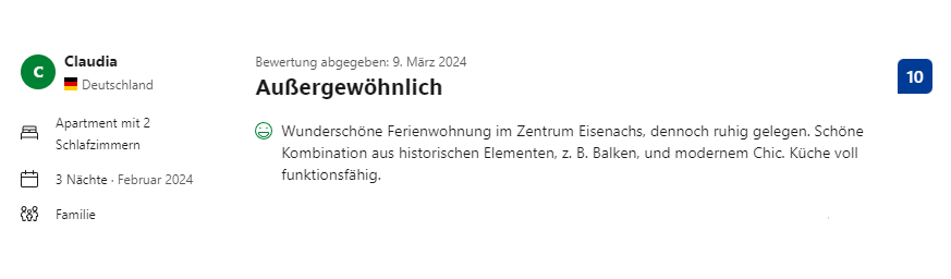 Entdecken Sie den historischen Stadtkern von Eisenach, während Sie in einer eleganten 4-Sterne-Wohnung übernachten. Die Wohnung befindet sich in der Nähe des Theaters und der Fussgängerzone – Sie erreichen in wenigen Minuten sämtliche Sehenswürdigkeiten. Mit dem Bus oder zu Fuß erreichen Sie auch in 10 Minuten die Startpunkte wunderschöner Wanderwege rund um die Wartburg.