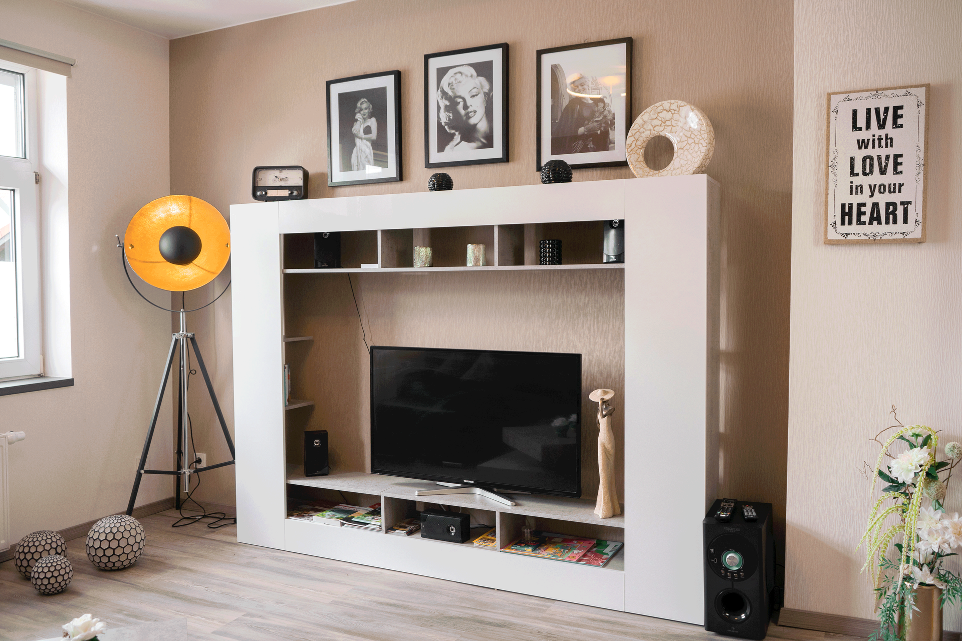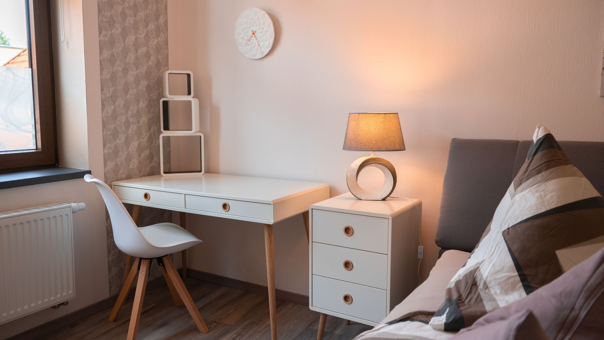 - ein Wohnzimmer mit Smart TV, einer Musikanlage und einer Eckcouch, welche als Schlafcouch verwendet werden kann