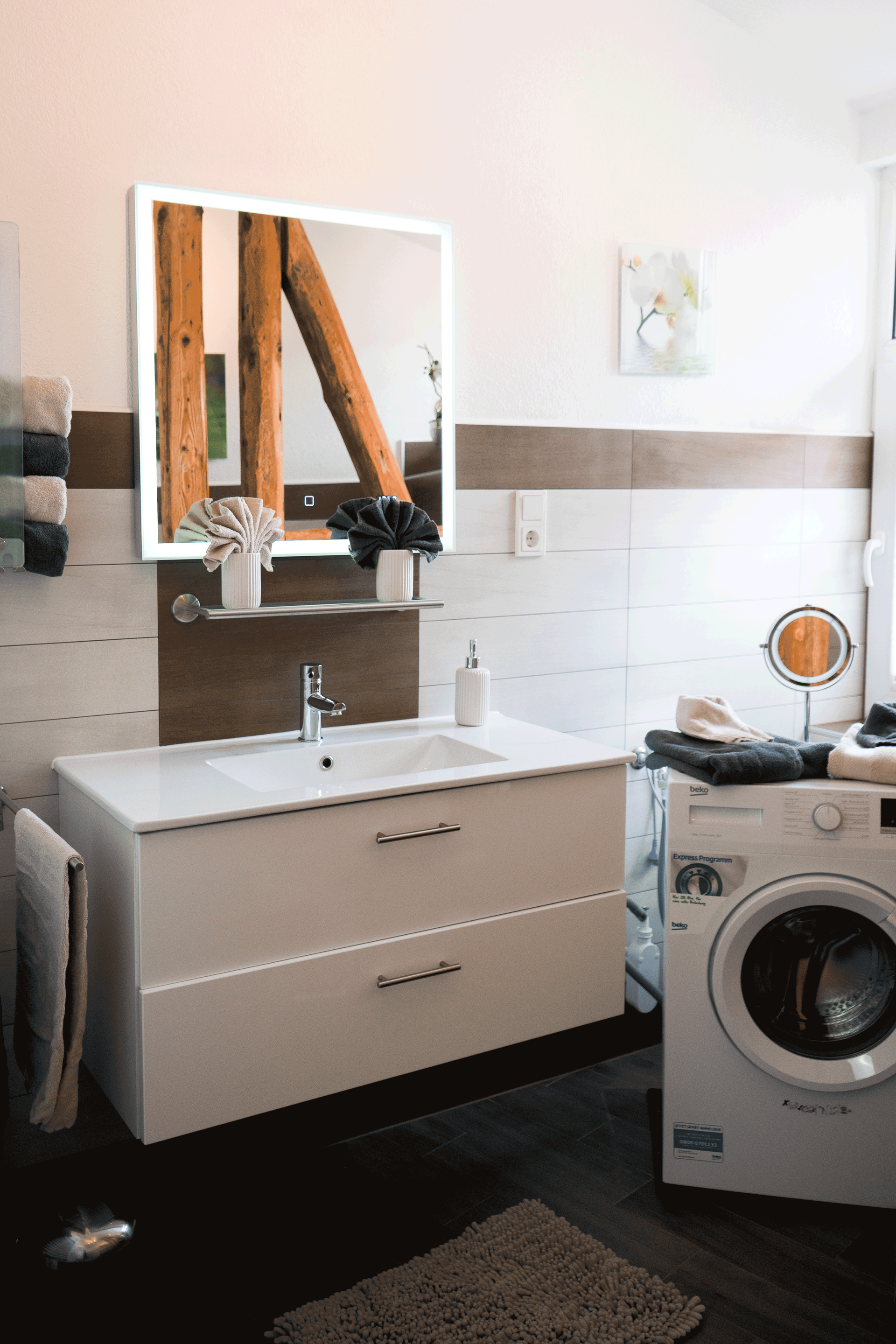 - ein Badezimmer mit Dusche, Föhn/Haartrockner, Schminkspiegel, und Waschmaschine