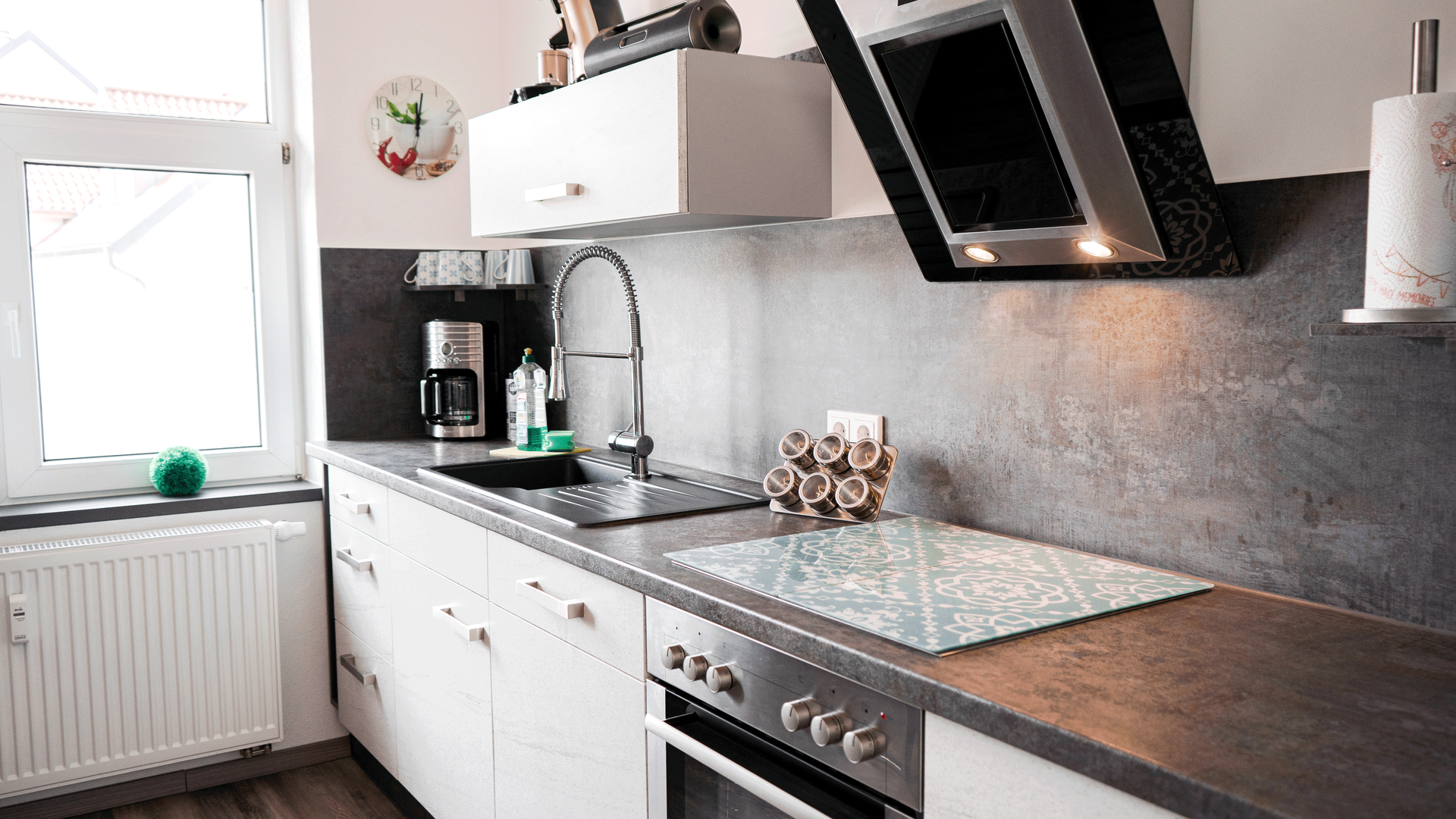 Küche mit allen notwendigen Küchenutensilien + Zusatz: Kaffeemaschine, Spülmaschine, Backofen und Mikrowelle