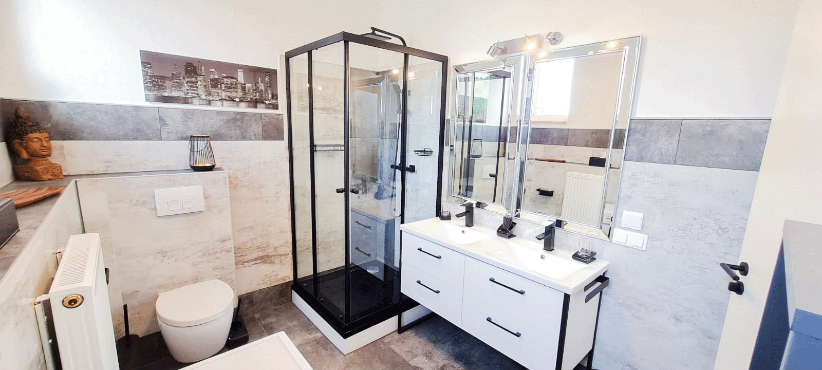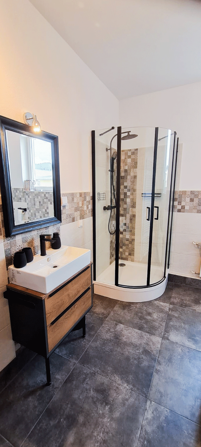 - zwei Badezimmer mit jeweils einer Dusche, WC, Föhn/Haartrockner, Schminkspiegel