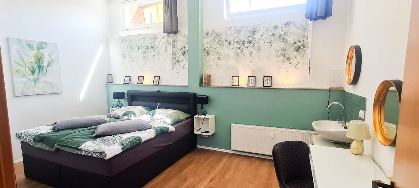 - vier Schlafzimmer mit Doppelbett/Boxspringbett, TV, Schreibtisch / Schminktisch