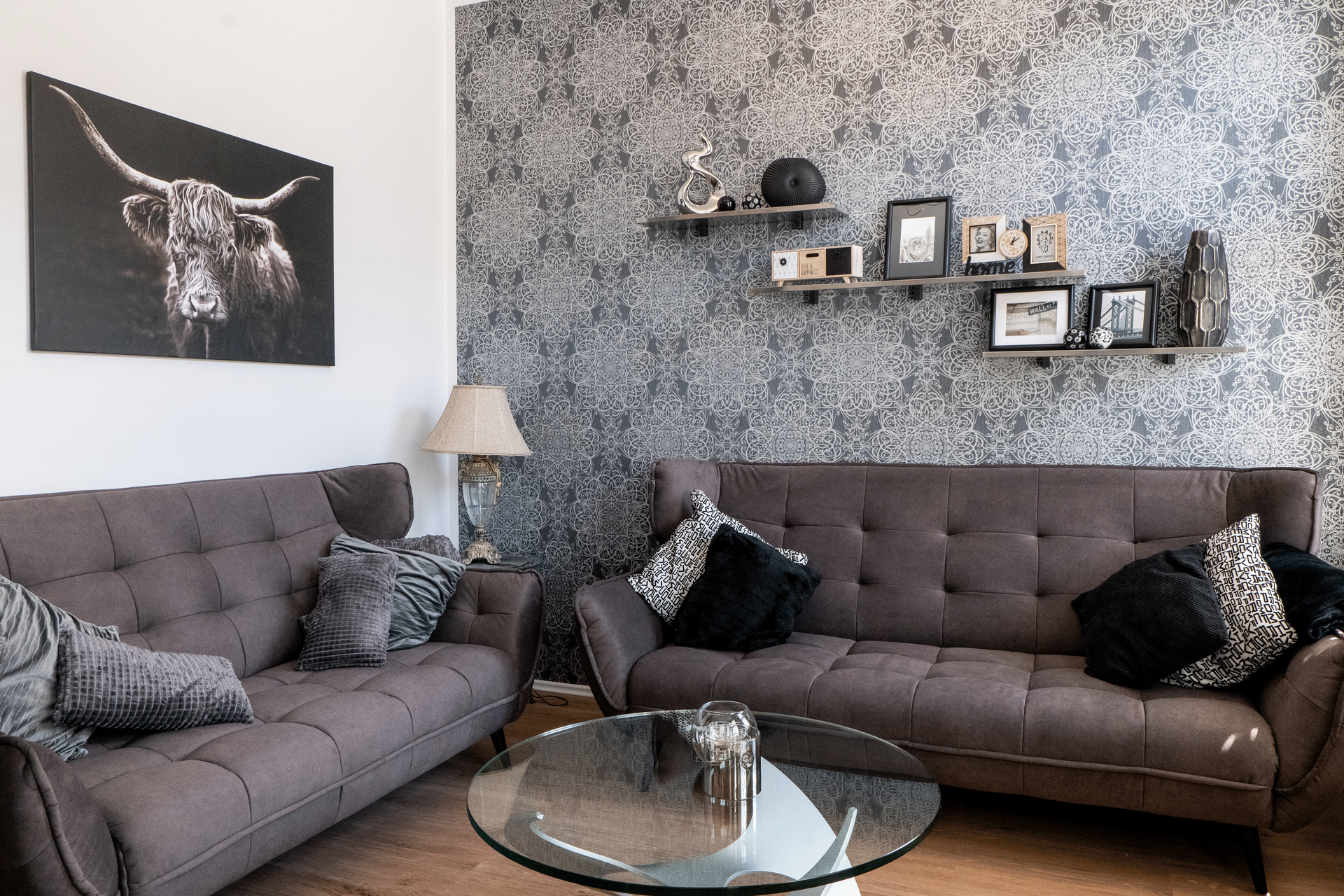 - ein Wohnzimmer mit Smart TV und zwei große Couches